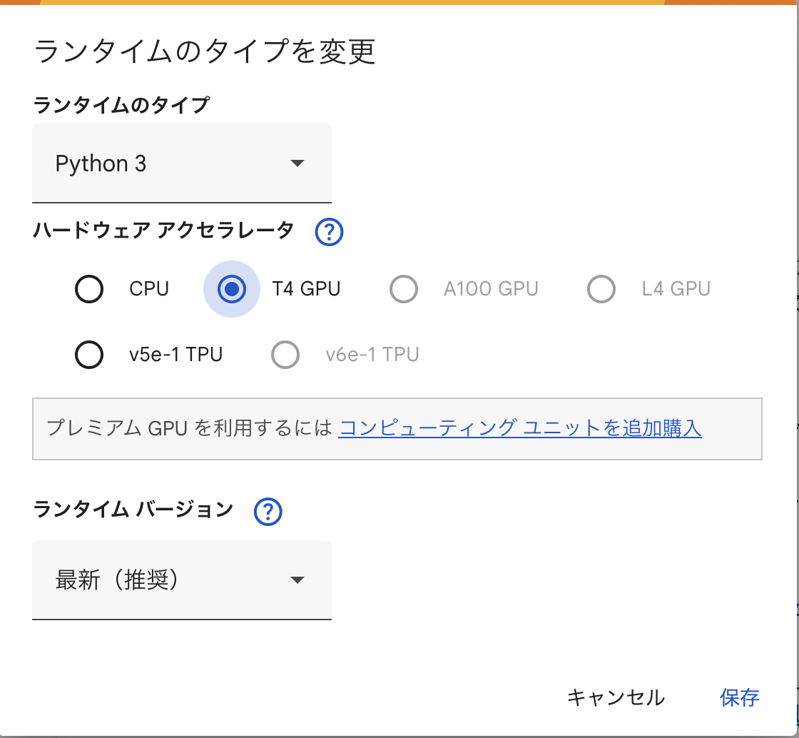 Google Colabの「ランタイムのタイプを変更」でCPUからGPUに変更する