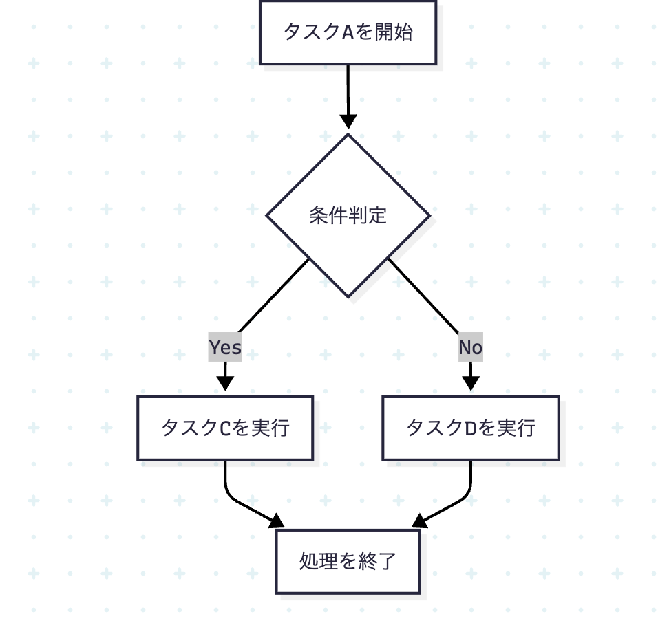 marmaid graph TD A[タスクAを開始] --> B{条件判定}; B -- Yes --> C[タスクCを実行]; B -- No --> D[タスクDを実行]; C --> E[処理を終了]; D --> E;